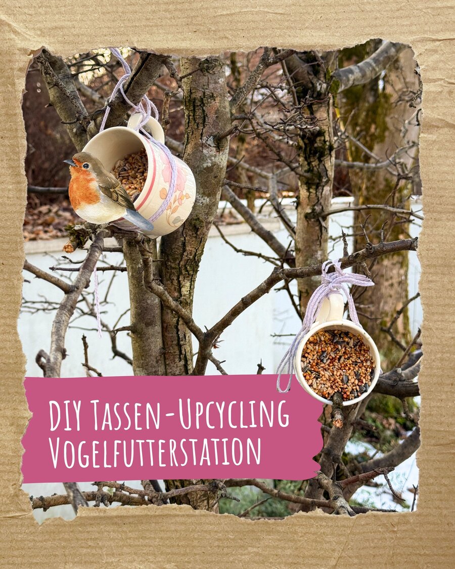 Am nächsten Tag bindet ihr die Stoffbänder an die Tassenhenkel und hängt eure DIY-Upcycling-Vogelfutterstationen zum Beispiel an einem Baum auf. Viel Spaß beim Basteln und Vogelbeobachten!