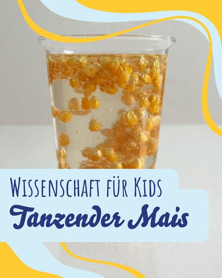 Zuerst sinken die Maiskörner im Wasserglas auf den Boden. Wieso? Weil sie eine höhere Dichte haben. Eine höhere Dichte bedeutet, dass in einem Gegenstand die Teilchen besonders eng aneinander liegen. Dadurch ist der Mais schwerer als Wasser.